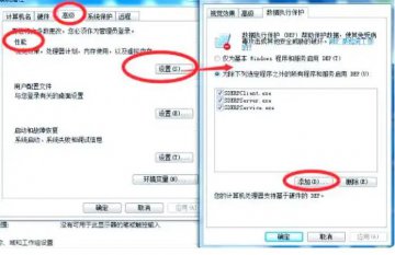 2,进行在“我的电脑”上右键-----点击“属性”-----高级”------“性能------数据执行保护”界面。,选择第二个选项,并逐一将速达软件安装目录中的绿色图标运行程序添加到列表中,完成后重启电脑。