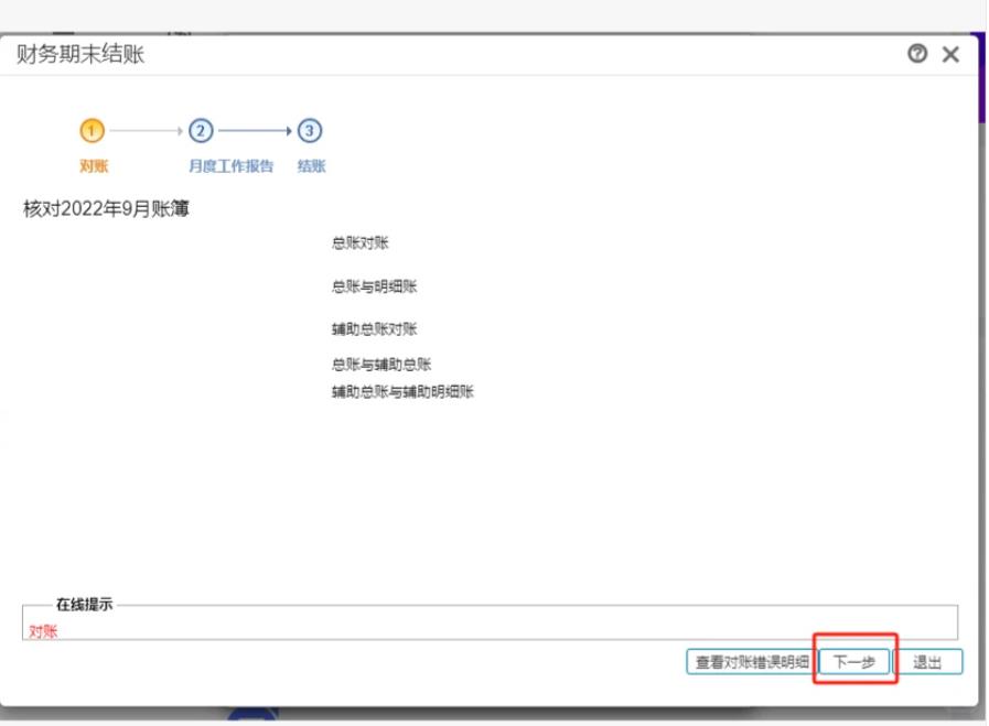 操作步骤 1、打开系统管理—财务结账 2、点击财务结账,可以看到已期末结账月份和未结账月份,选中最后一个结账月份可以取消结账 3、选中第一个未结账月份点击下一步,需要核对账簿 4、核算全部正确可以点击下一步,有错误项,可以点击查看对账错误明细 5、点击查看月度工作报告 6、全部通过即可进行结账并退出