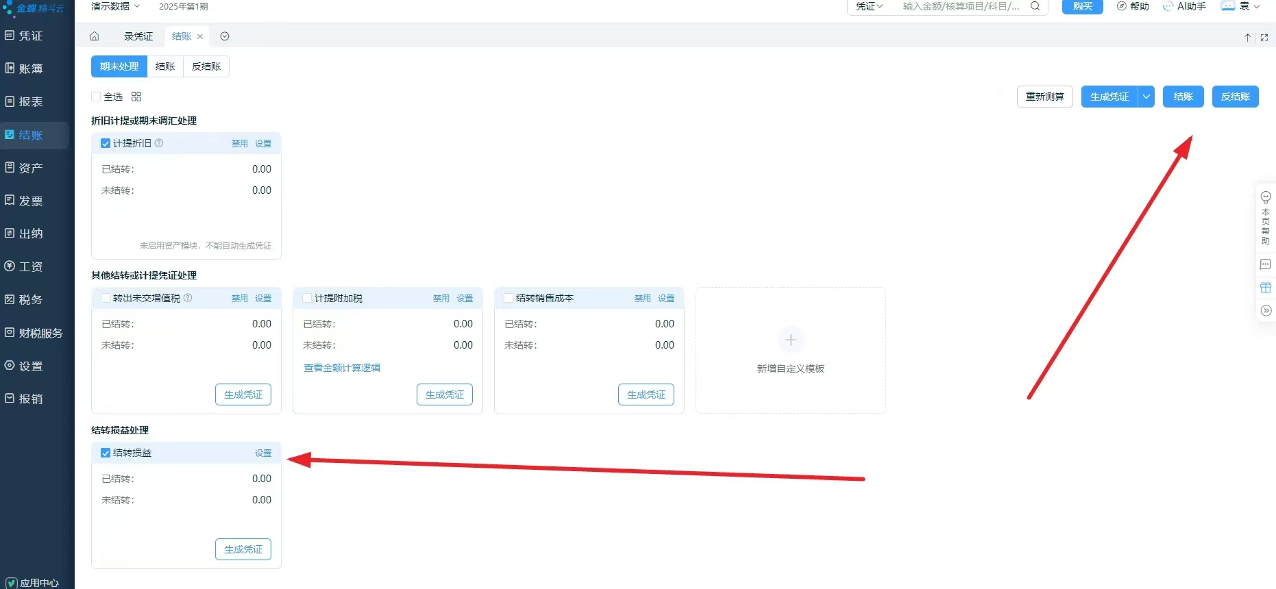 4.自动结转-损益结账。(用户可设置不用审核,记账。结账和反结账也可跨多个月份批量操作。调整账务比较方便。)