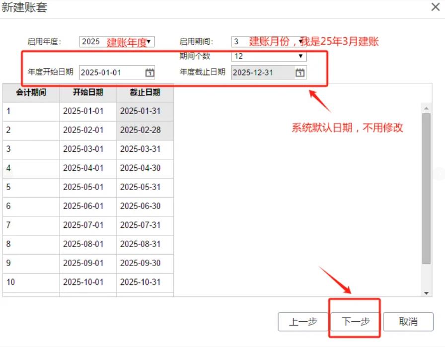 3. 选启用时间:选年度和月份(建议1月),期间数12,点下一步。