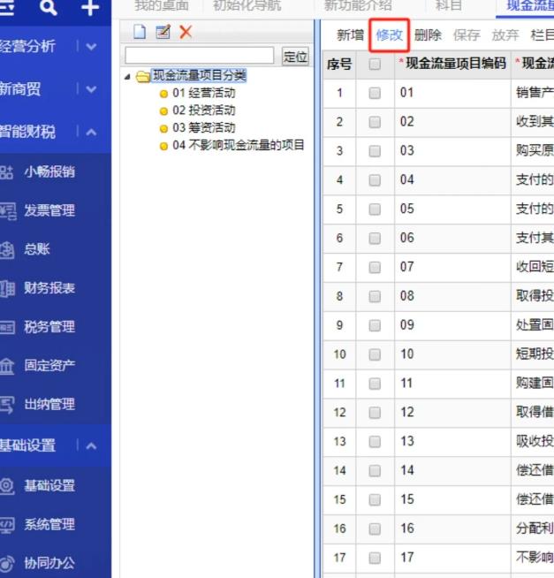2.打开【基础设置】-【现金流量项目】,软件有预制常用的现金流量项目,也可以根据需要做增减或者修改操作;