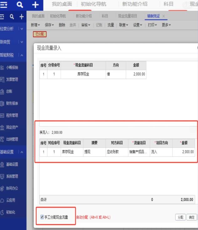 (2)手工分配:在凭证界面点击【流量】菜单,勾选左下角【手工分配现金流量】,然后选择需要分配的【现金流量项目】即可。