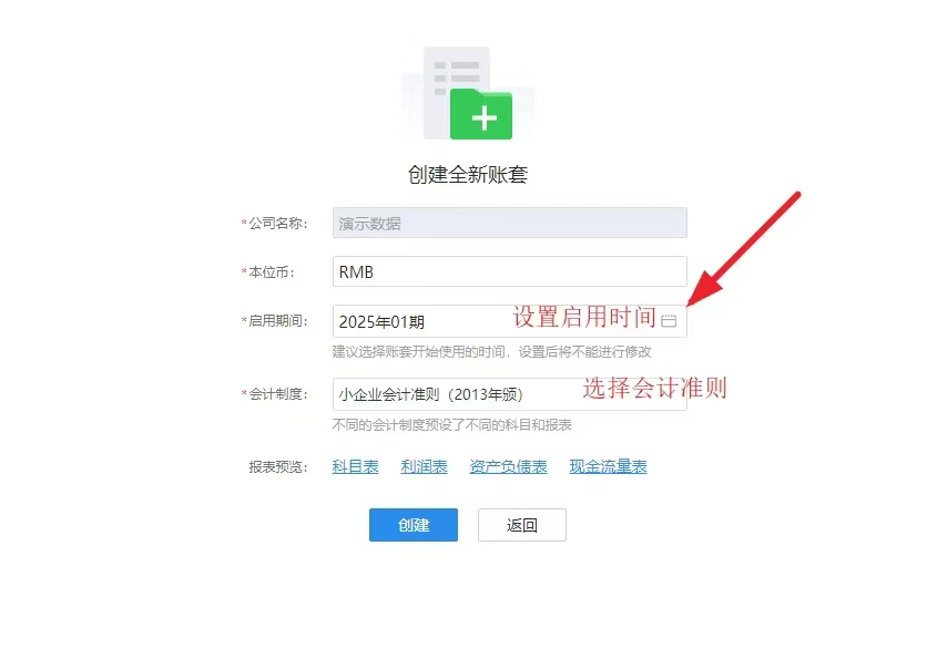 1.一步建账(设置会计准则,启用期间即可。)